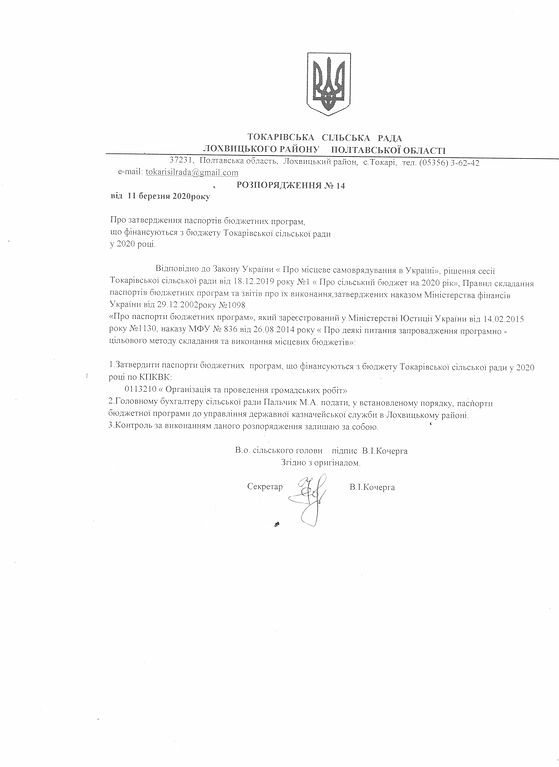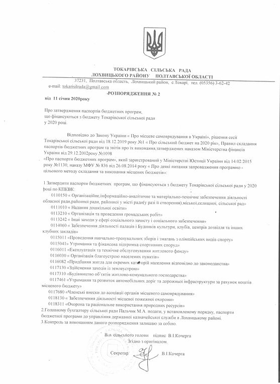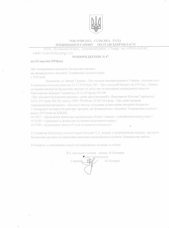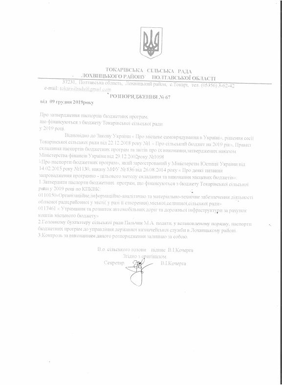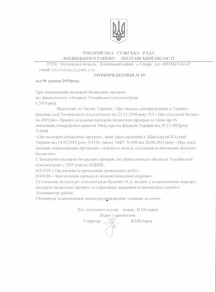 ТОКАРІВСЬКОЇ СІЛЬСЬКОЇ РАДИ У 2019 РОЦІ